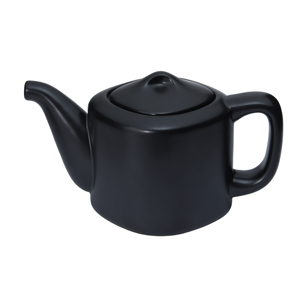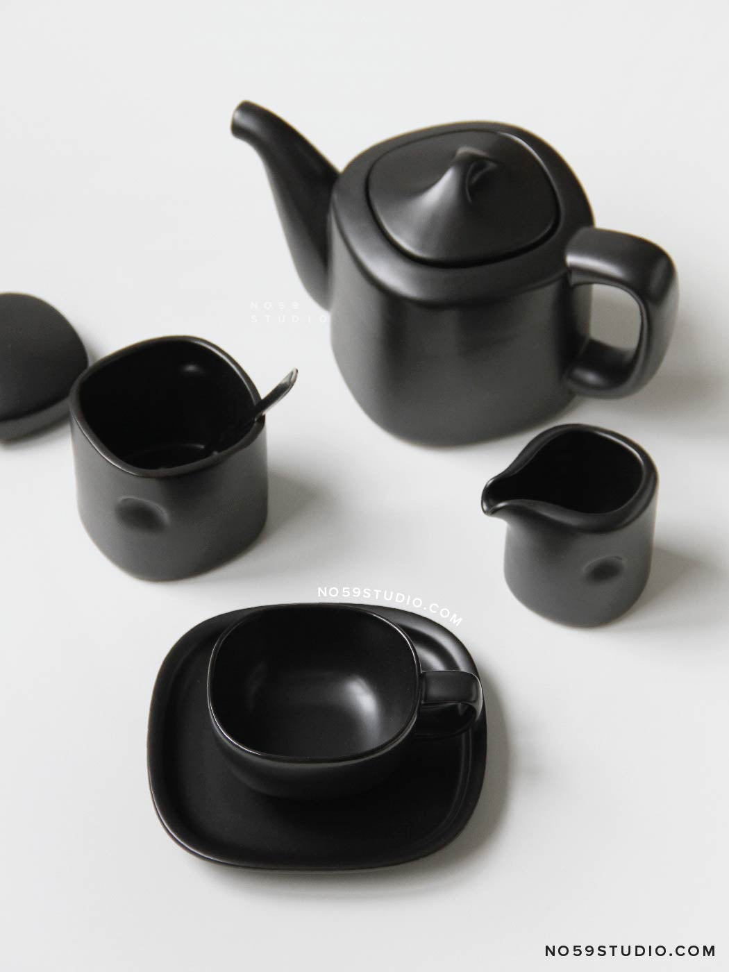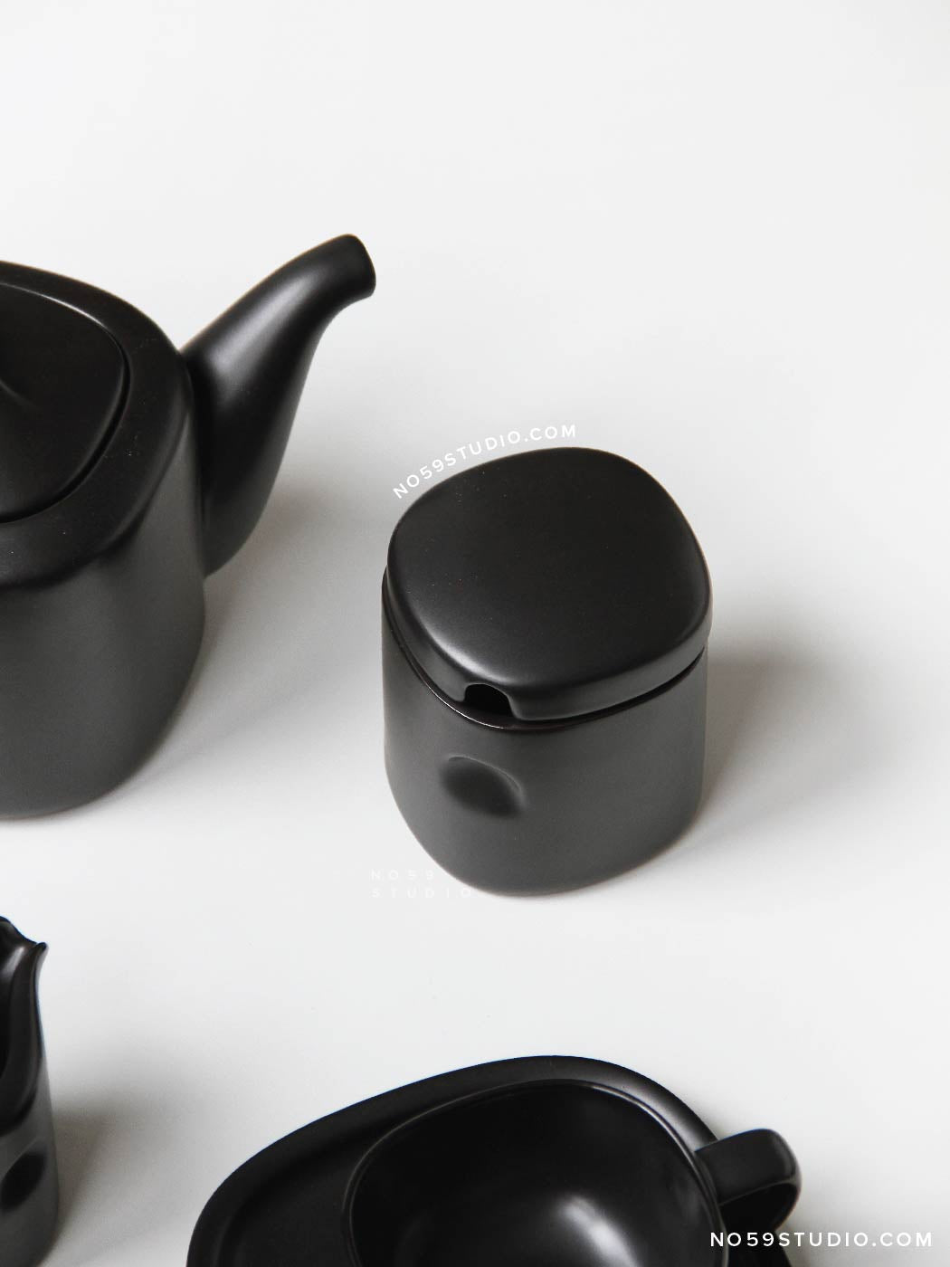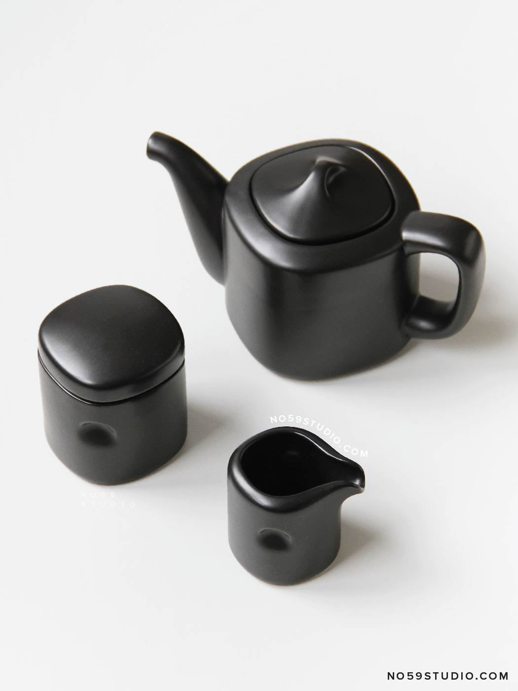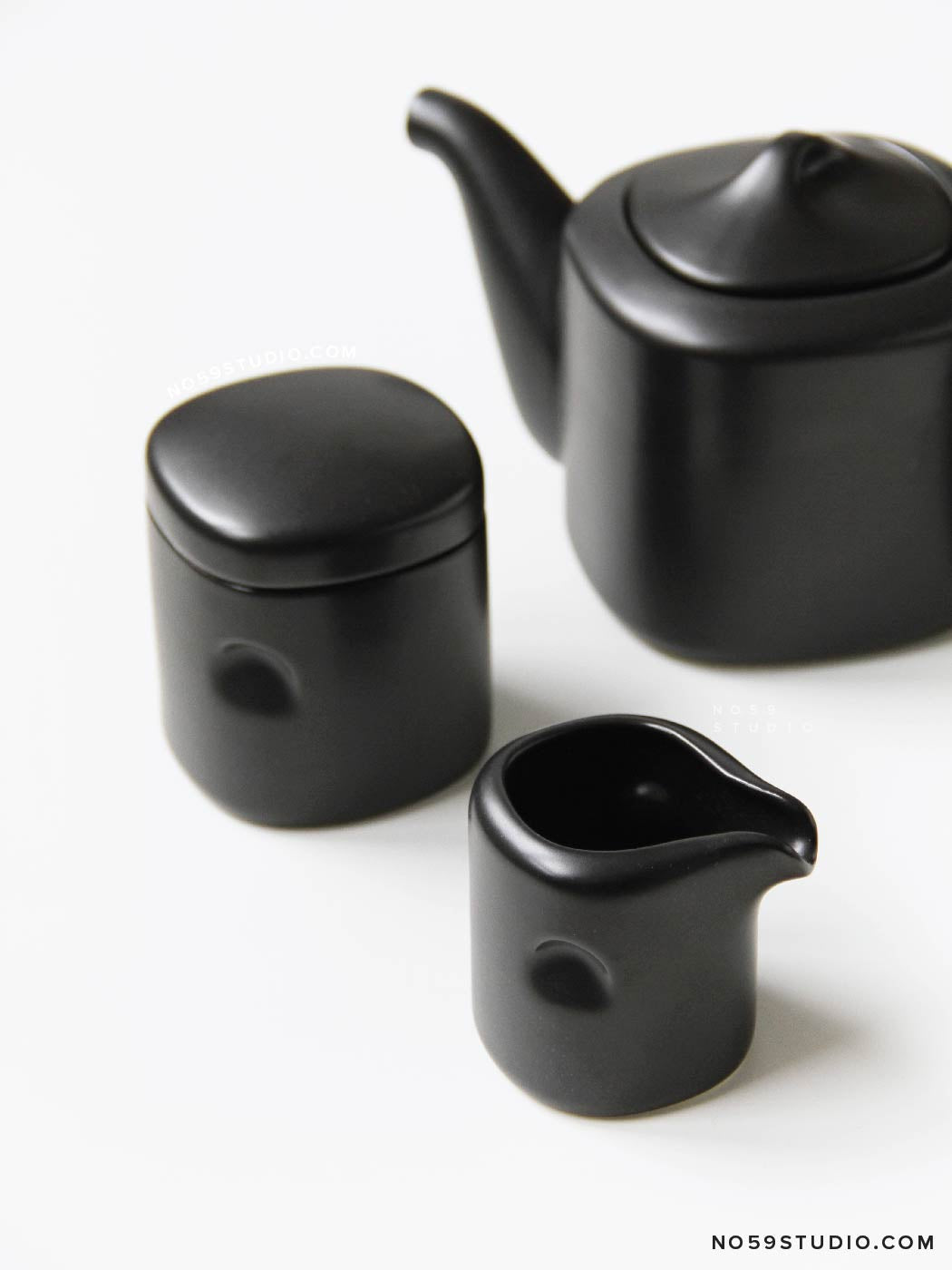 The teapot, with a capacity of 828 ml, features a well-designed, easy-to-hold handle. The milk pitcher (creamer) features a seamlessly integrated body and spout with a side grip for easy handling. The sugar bowl includes a similar shape with a lid that has a cut-out for conveniently placing a spoon or utensil. The black matte finish on each piece adds a rich and sophisticated touch.