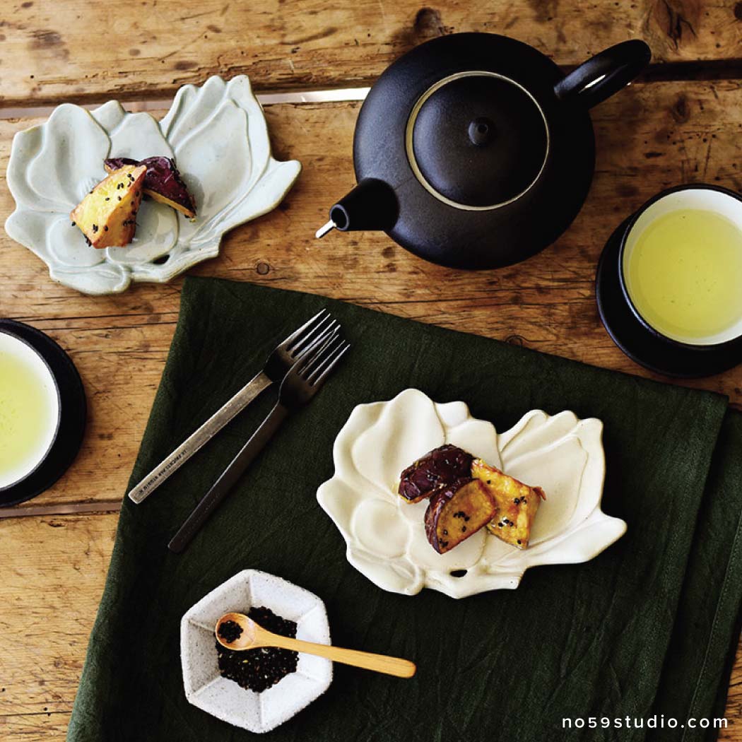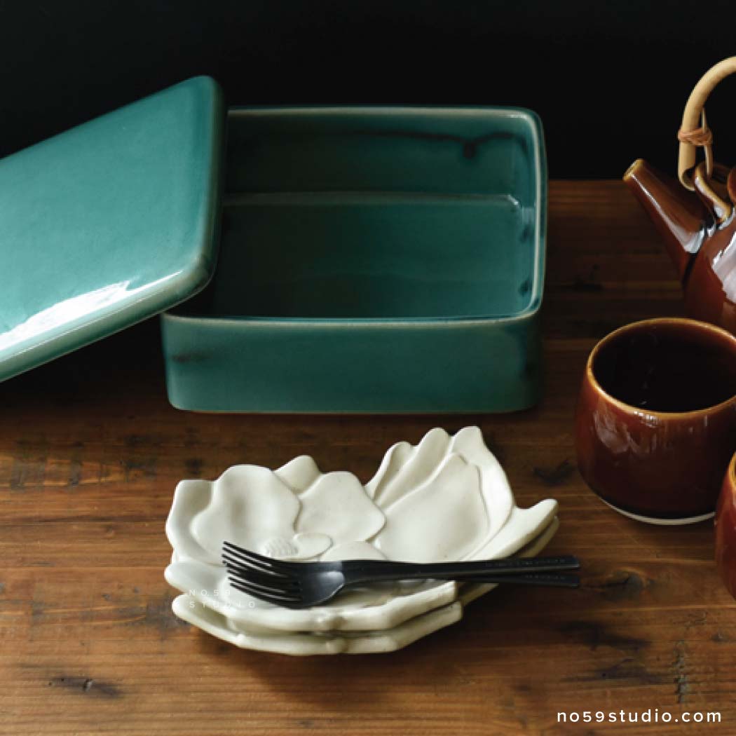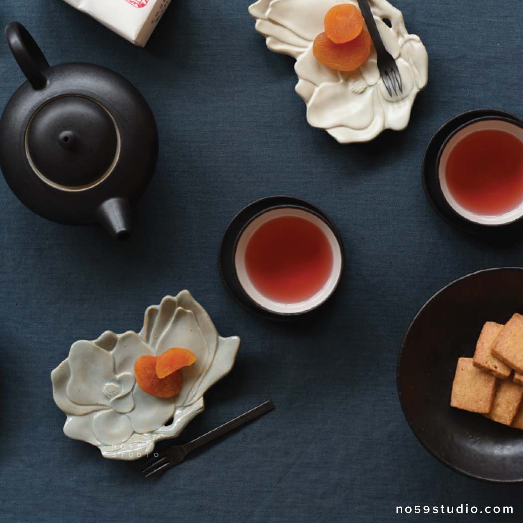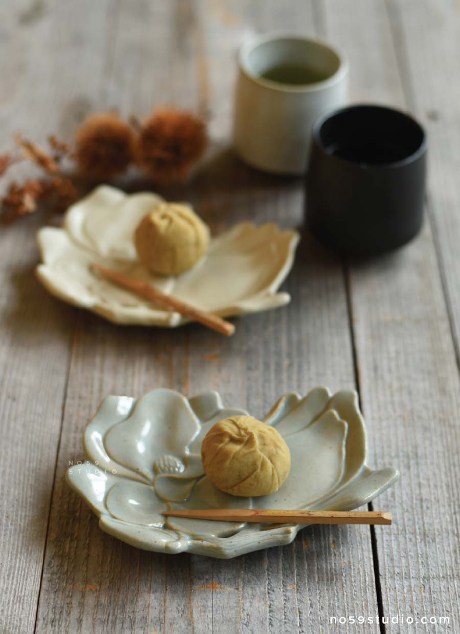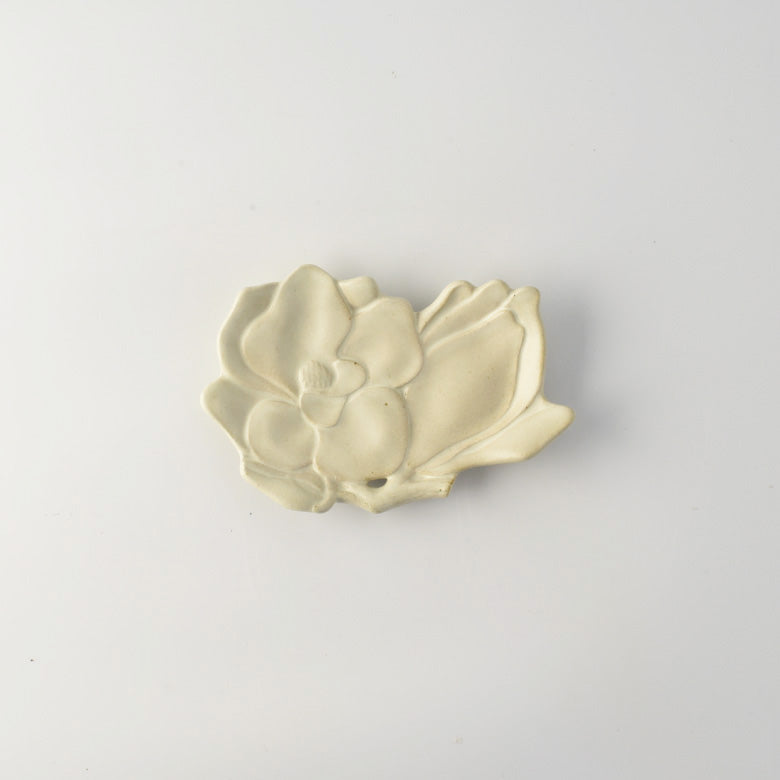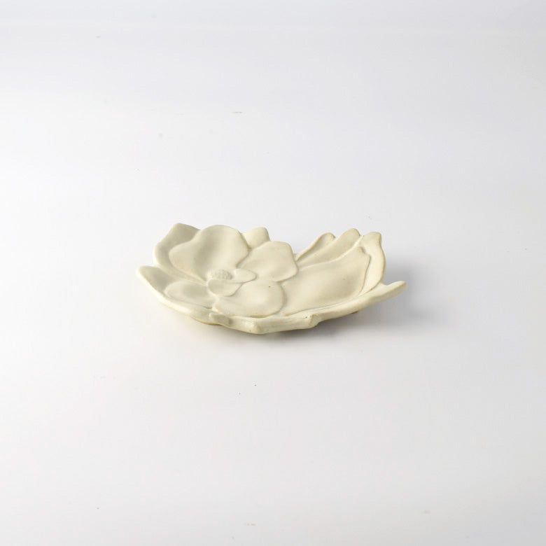 Made from a combination of white earthen clay, celadon glaze, and white matte glaze that create a rustic feel, this confectionery plate represents a beautiful magnolia flower. The softly appealing layered petals gently cup a "wagashi," adding a rhythmic effect to the overall look and enhancing the beauty of the food. Whether entertaining guests or indulging yourself during tea time, consider plating sweets such as chocolate, baked pastries, and a piece of "wagashi."
