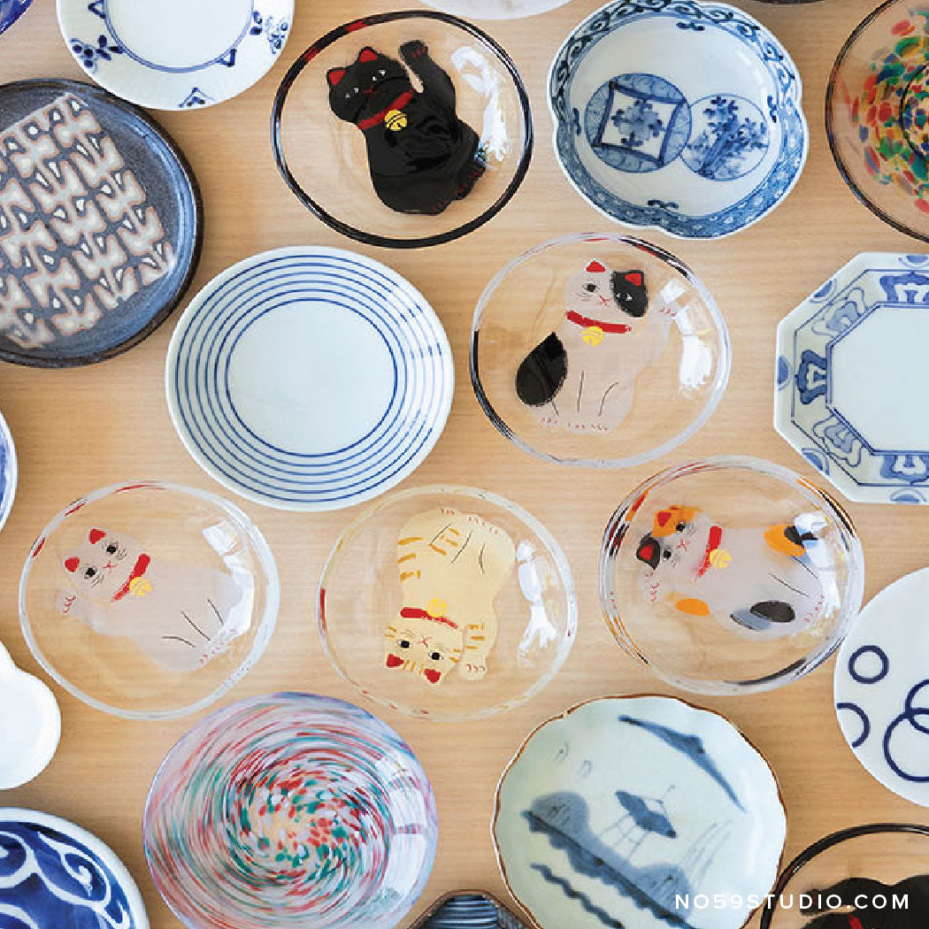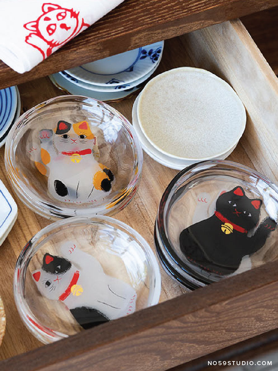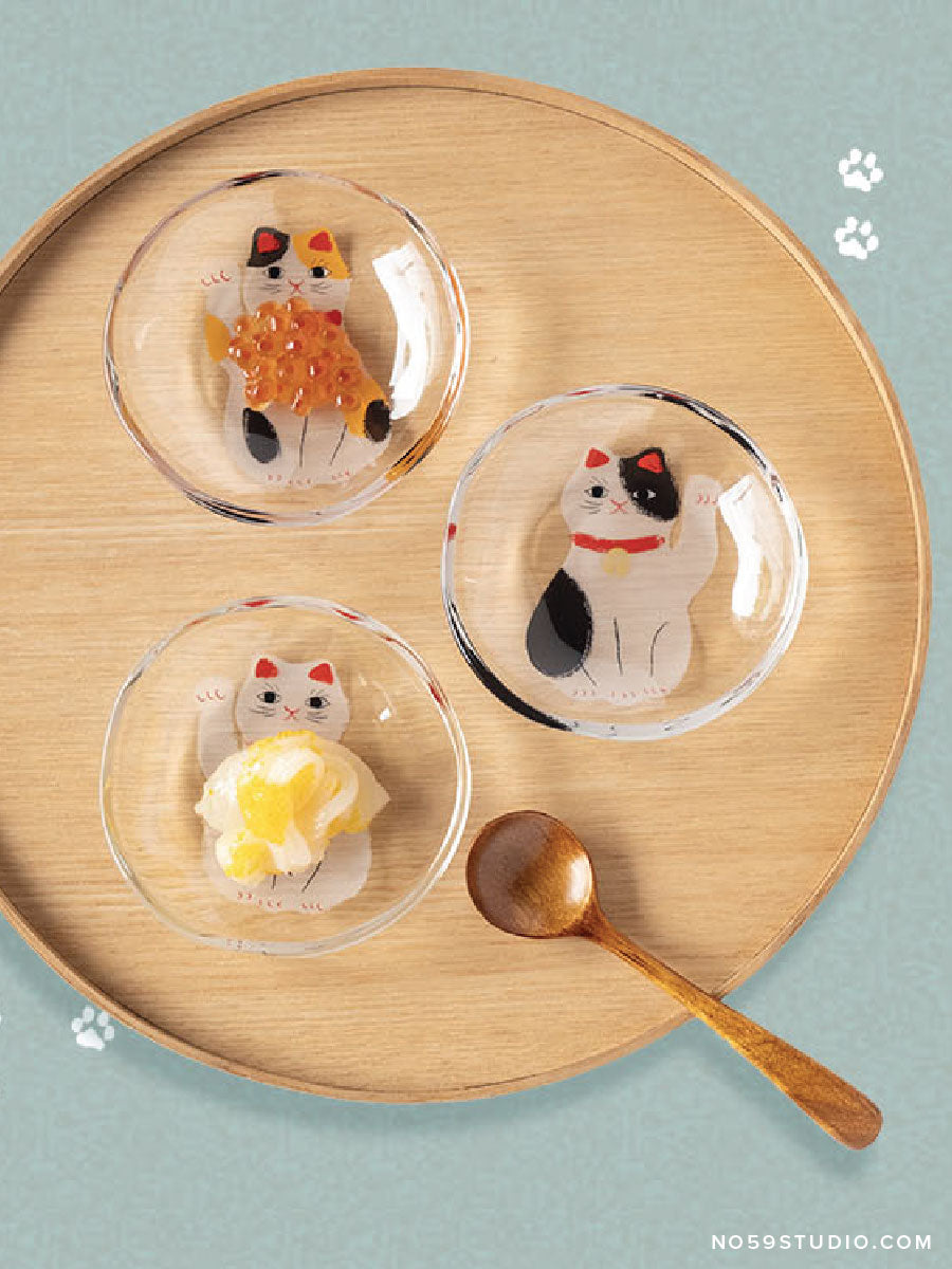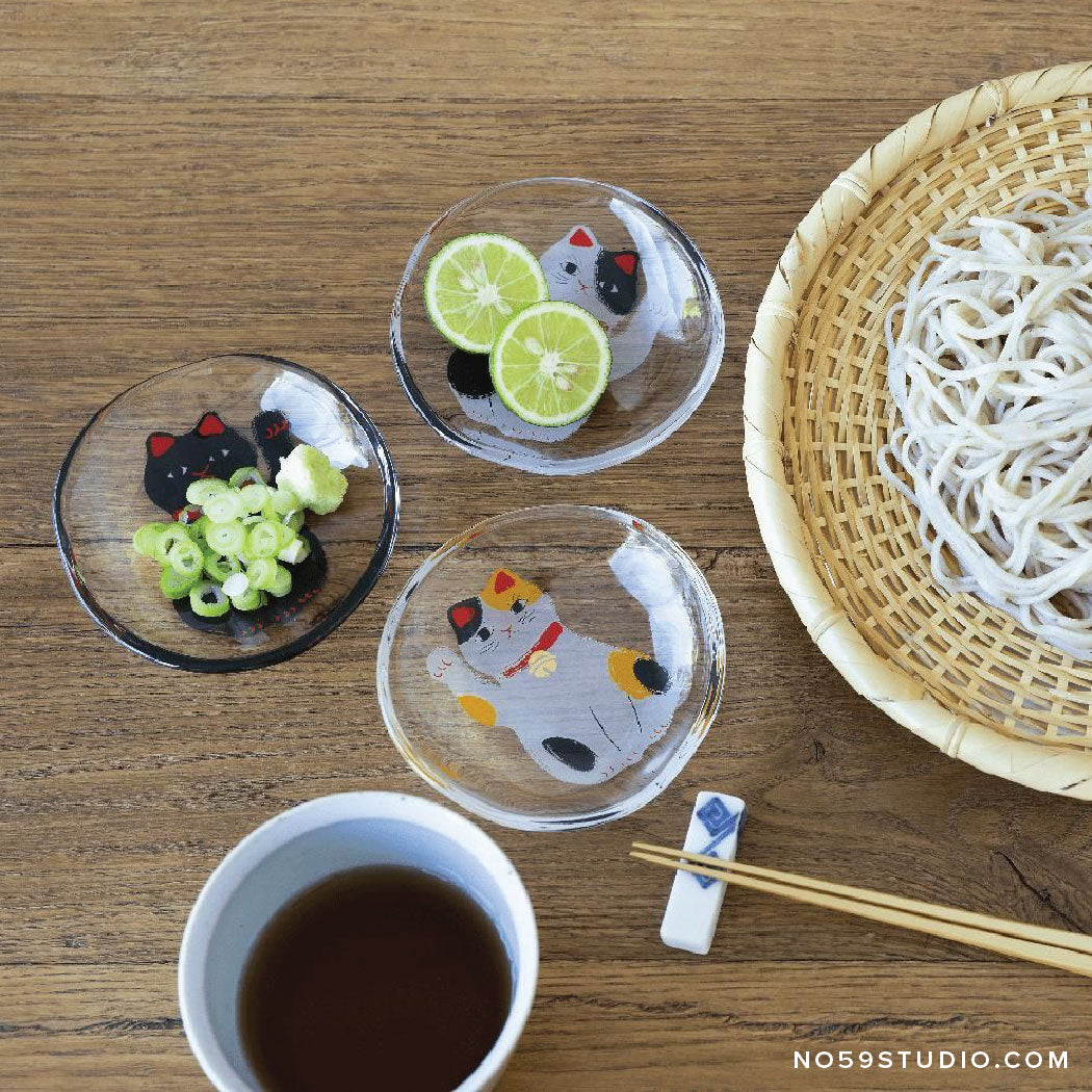 According to tradition, a raised right paw invites wealth and fortune, while a raised left paw welcomes people — and each color and pattern carries its own unique meaning. This timeless symbol is beautifully reimagined in the Medetamono Lucky Cat Mini Glass Plates, each one holding its own charm and story.