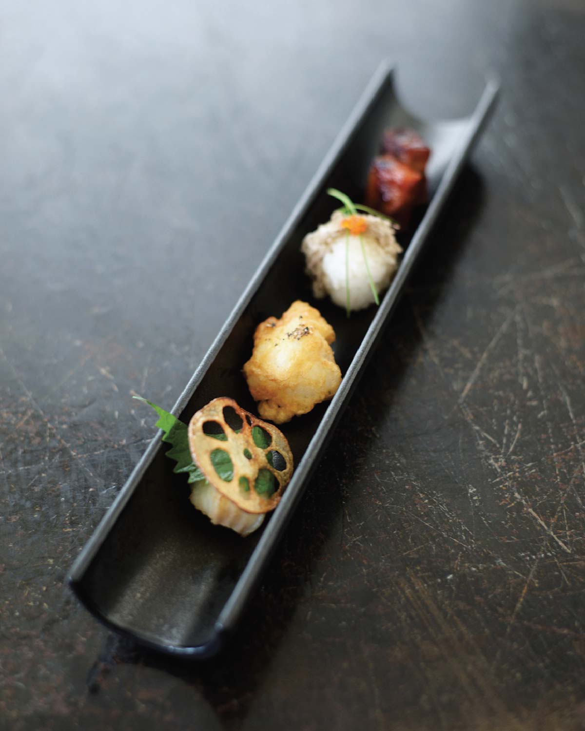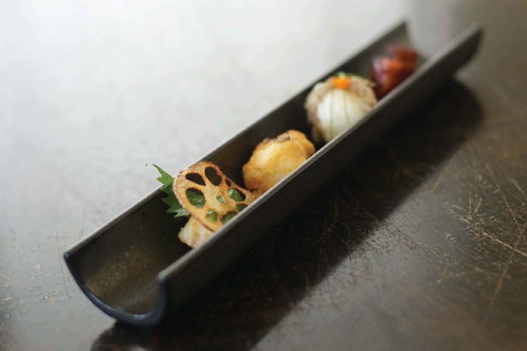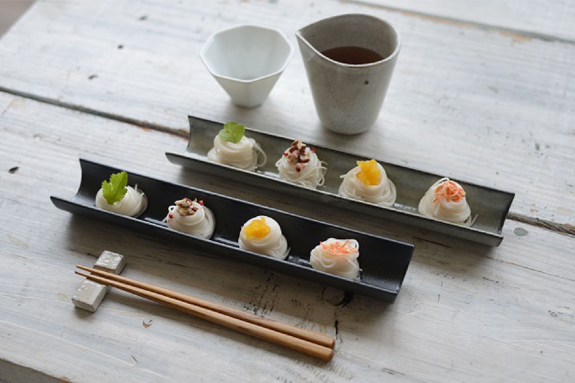 “Quadro” means square or a canvas for oil painting in Italian. The long, narrow shape enables making a food presentation in an interesting and modern way! The shaded glaze leaves the viewer with an impression of depth. A stretch of imagination of possible menus (both Japanese and western style) is right there.